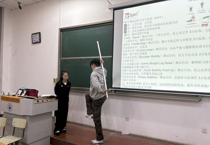 理论授课环节,任凯玲治疗师以“运动损伤防治与康复”为核心主题,系统讲解了运动损伤的发生机制、科学预防策略、现场紧急处理流程及后续康复训练方法。她特别指出,运动损伤的预防需贯穿科学训练规划、合理恢复安排、功能性筛查等多个维度,且损伤的防治与康复过程本身就是劳动技能的实践过程,要求学生以严谨细致的劳动态度对待每一个操作细节。此外,她还针对伤后康复锻炼的阶段性安排、支持带的正确使用技巧、局部与全身协同治疗方法等内容展开详细阐述,知识体系完整、逻辑清晰。