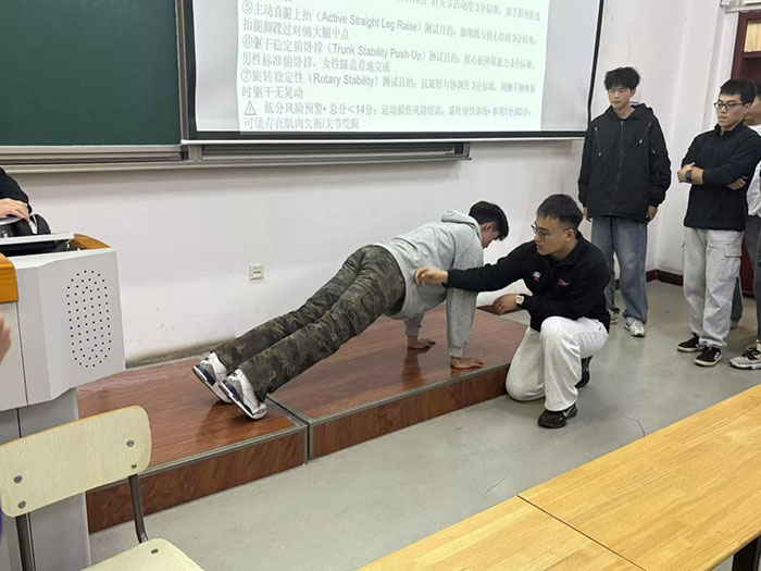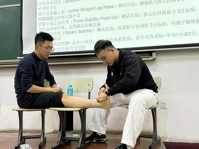 讲座尾声,同学们围绕日常训练中遇到的肌肉拉伤、关节损伤等实际问题,向两位专家请教解决方案。人工智能学院肖玺耀同学在交流中表示:“这次培训不仅让我系统掌握了运动急救与康复的专业知识技能,更在实操过程中提升了劳动动手能力,培养了严谨认真的劳动态度。”