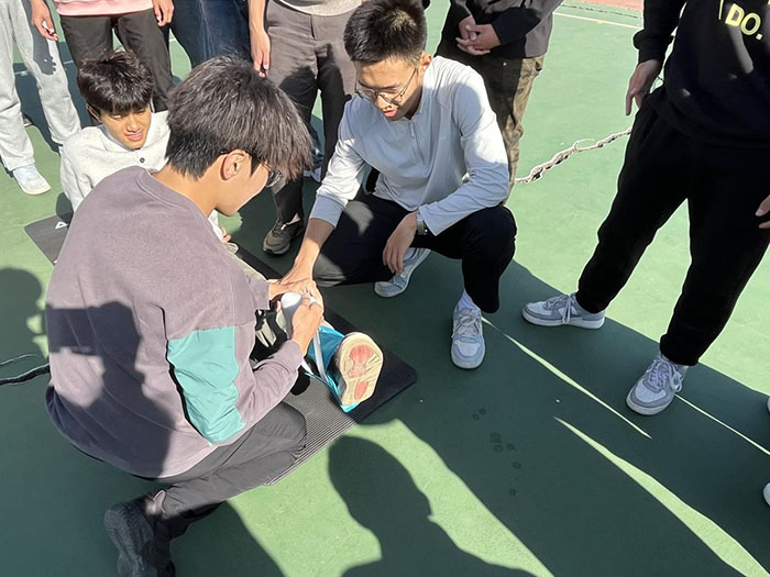 此外,培训还围绕损伤应急处理与运动优化展开重点教学。主讲人详细拆解急性崴脚、肌肉拉伤等突发状况的应急处理流程,包括冷敷时机、加压包扎方法、抬高患肢的正确姿势等实操要点。针对篮球运动中的关键技术动作,通过一对一纠错的方式,纠正运球时的重心偏移、起跳时的发力失衡、落地时的缓冲不足等问题,帮助学生优化运动发力方式,减少动作不当引发的损伤。同时,课程还涵盖护具的正确选择与佩戴技巧,传授PNF拉伸技术、赛后静态拉伸及肌肉放松按摩方法,让学生既掌握应急急救本领,也能养成科学运动、规范防护的良好习惯,在专业实践中切实锤炼劳动技能、提升劳动服务意识。