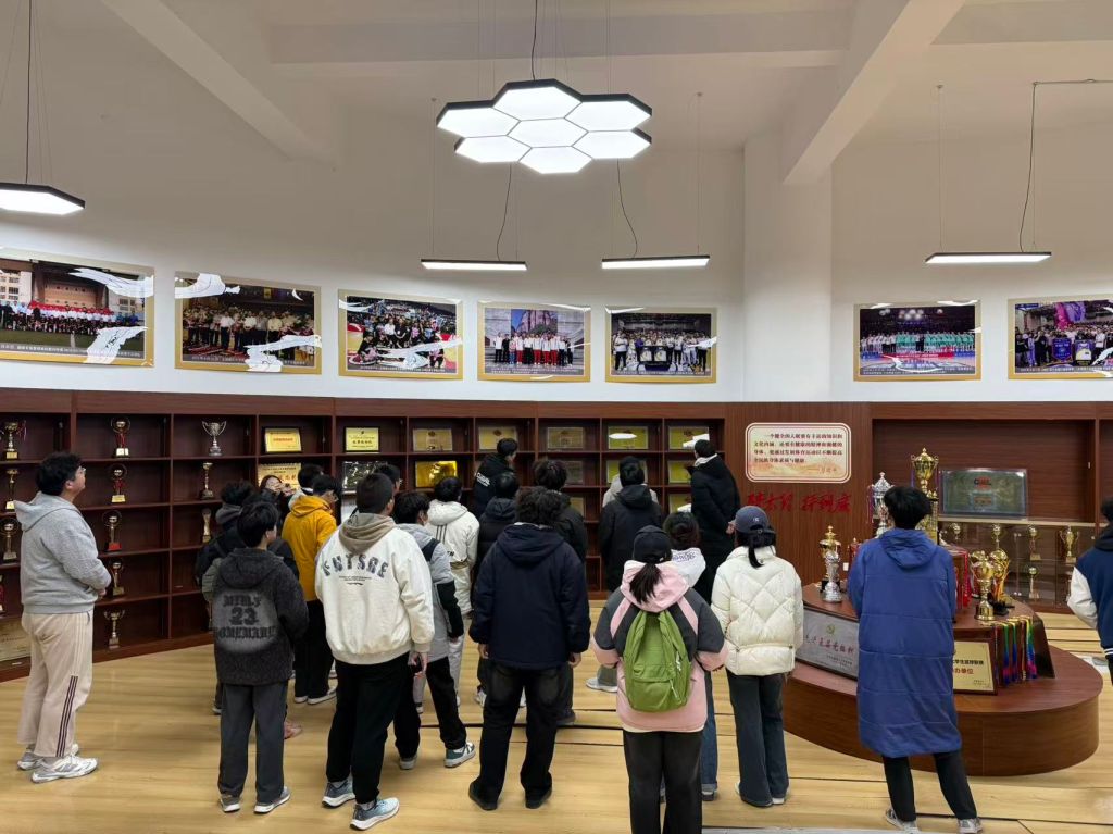 在参观过程中,两位男篮队员结合自身成长经历,分享了在刻苦训练、团队协作、伤病恢复、心理调适等方面的亲身感悟,强调每一次赛场表现背后都是对学校荣誉的坚守、对团队责任的担当和对自我极限的突破。同学们认真聆听、驻足交流,在“看得见、摸得着”的沉浸式实践场景中产生强烈内心共鸣。