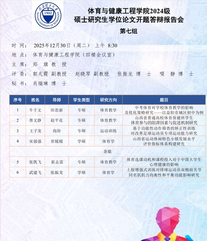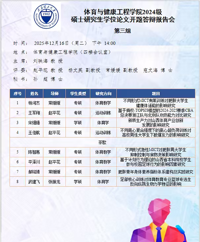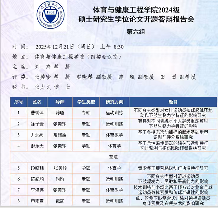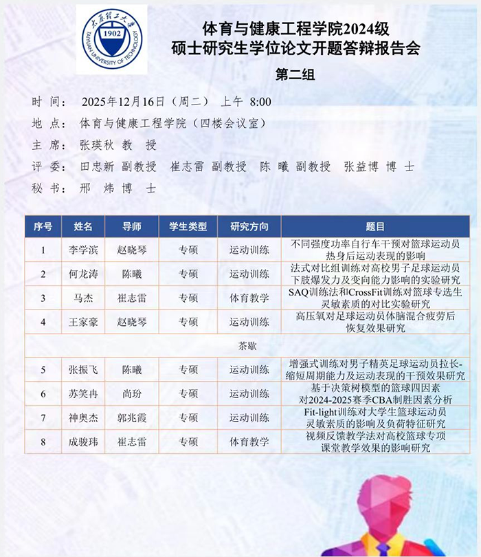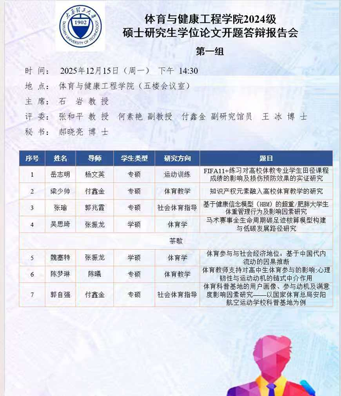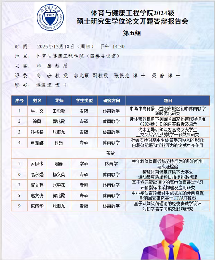 12月15日至30日,体育与健康工程学院进行了2024级硕士研究生学位论文开题答辩报告会。根据研究方向,报告会分为7组进行,分别邀请校外专家北京体育大学张瑛秋教授、北京体育大学刘卉教授、山西师范大学郑旗教授、山西大学石岩教授、山西大学刘映海教授和山西大学吴丽君教授担任答辩委员会主席,体育与健康工程学院硕士研究生导师担任答辩委员会成员。开题过程严格遵循学校研究生培养的相关规定与程序要求。