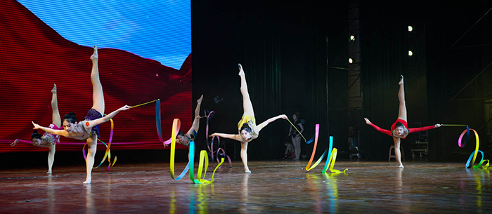 艺术体操《闪耀之星》与《我爱你中国》,刚柔并济,翩然舒展间绽放体育与美的交融之美。武术汇演《无双》招式凌厉、气势如虹,尽显中华武术的博大精深与浩然正气。健身健美展示力量与美感,肌肉线条分明,生动诠释了健康体魄的阳刚之美。体操专选《我要学霹雳舞》创意十足,将体操技巧与流行舞步巧妙融合,动感十足、活力满格。体育题材小品《篮不住的热情》幽默风趣,道出训练生活中的苦与乐,引发全场热鸣。