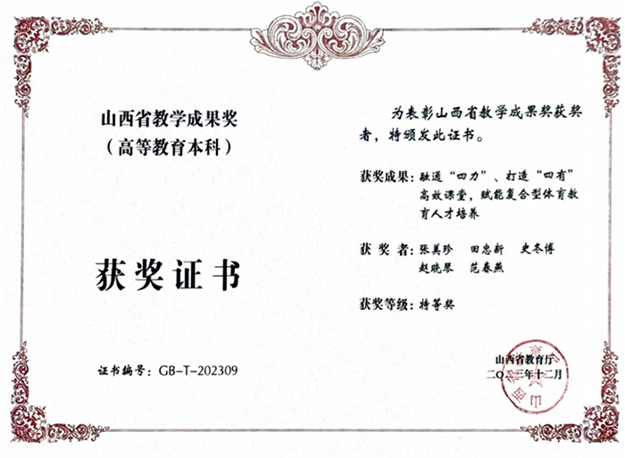 在2023年山西省教学成果奖(高等教育本科)评选中,由我院张美珍教授牵头的教学成果《融通“四力”、打造“四有”高效课堂,赋能复合型体育教育人才培养》荣获特等奖。这是对我院长期深耕教学改革、致力人才培养创新的高度认可。