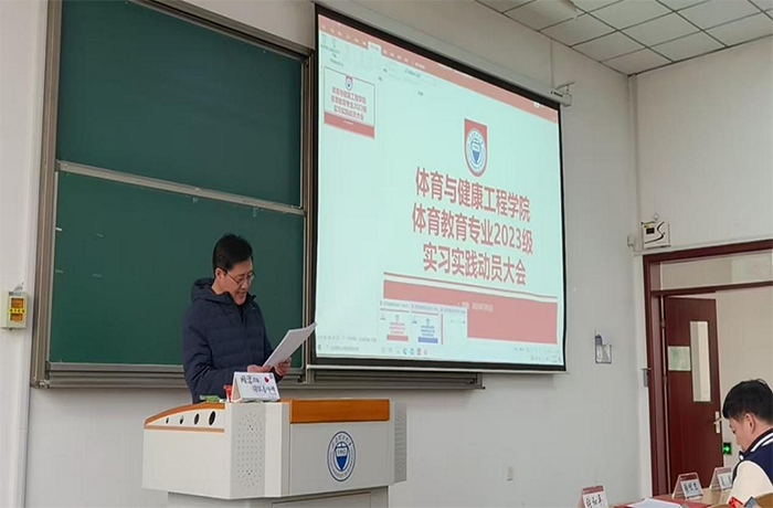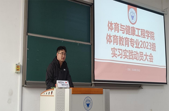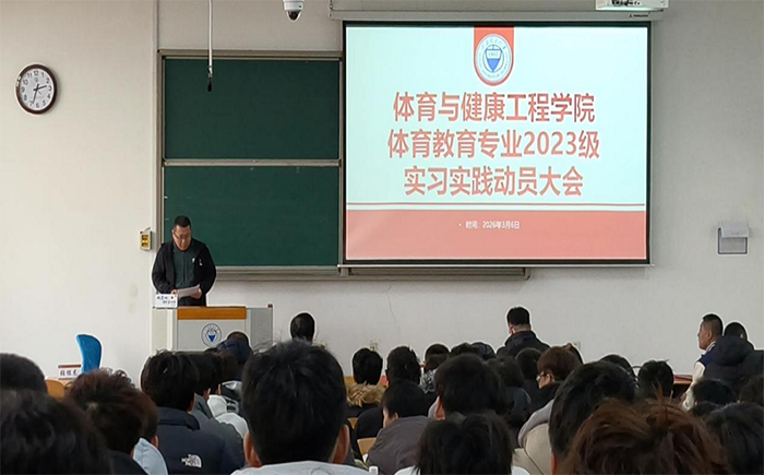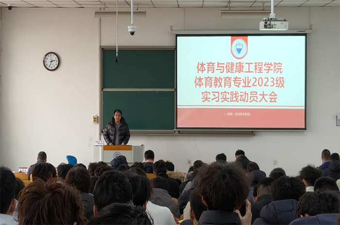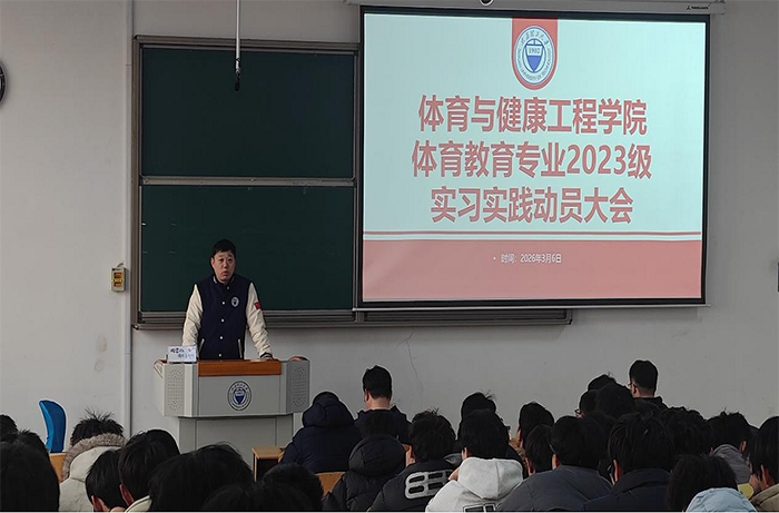 为深入贯彻落实习近平总书记关于体育工作的重要论述,全面对标2026年全国两会关于坚持健康第一教育理念、加快建设健康中国和体育强国的部署要求,聚焦立德树人根本任务,强化以体育人、促进青少年身心健康全面发展,扎实推进实习实践教学环节,全面提升体育教育专业学生综合素养与教育教学实践能力,2026年3月6日下午,体育与健康工程学院在明向校区行思楼B322教室隆重召开体育教育专业2023级本科生校外实习动员大会。学院党委书记张体卫、副院长张和平、团委副书记兼学工办副主任姜昆出席会议,各实习点带队教师和2023级体育教育专业全体学生参加。会议由体育教育系副主任张振龙博士主持。