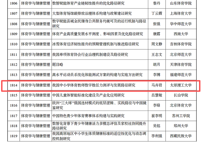 9月5日,全国哲学社会科学工作办公室公示了2025年国家社会科学基金年度项目立项名单,我院教师马卉君申报的《我国中小学体育教师数字胜任力测评与发展路径研究》课题获批青年项目,实现当年立项新突破。