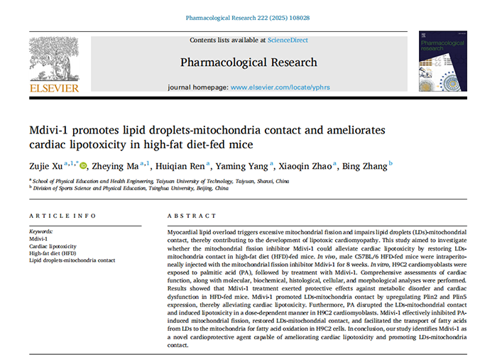 近日,我院徐祖杰副教授团队在国际著名期刊《Pharmacological Research》在线发表了题为《Mdivi-1 promotes lipid droplets-mitochondria contact and ameliorates cardiac lipotoxicity in high-fat diet-fed mice》的重要研究论文。《Pharmacological Research》是一本专注于药理学研究的高影响力期刊,被SCIE(Science Citation Index Expanded)数据库收录,为JCR-Q1、中科院2区Top期刊,影响因子为10.5。徐祖杰副教授与其指导的硕士研究生马哲莹为第一作者,太原理工大学体育与健康工程学院为第一署名单位。