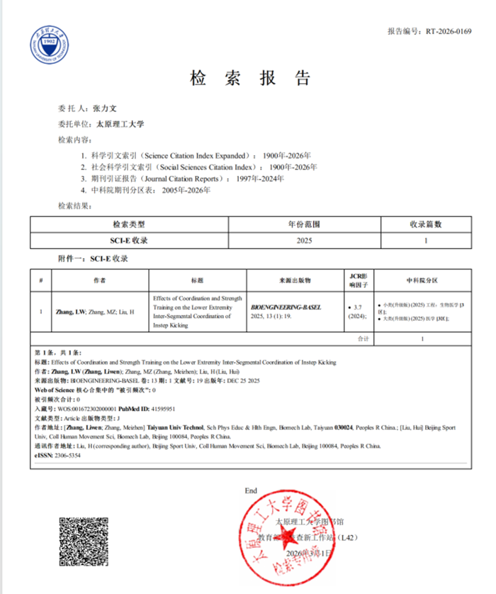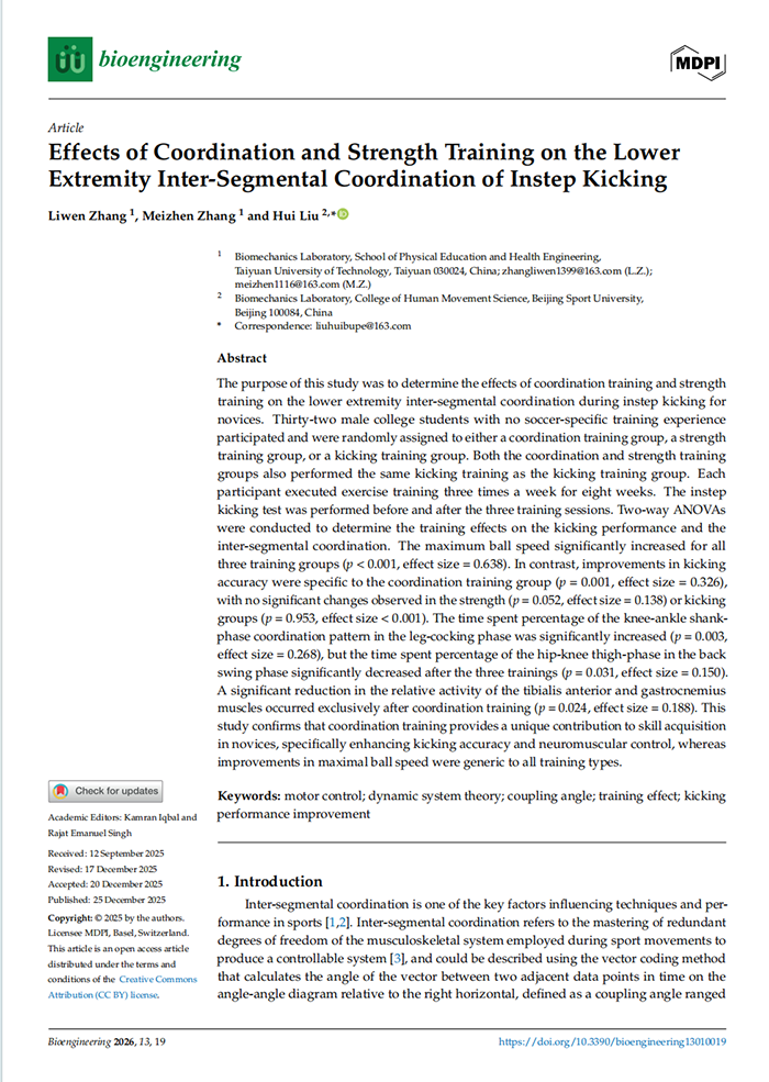 我院教师张力文博士的研究论文《Effects of Coordination and Strength Training on the Lower Extremity Inter-Segmental Coordination of Instep Kicking》在《Bioengineering》期刊在线发表。该期刊为生物医学与工程交叉领域的重要学术刊物,主要刊登生物工程、生物力学、生物医学技术及相关跨学科研究的最新进展。作为一本被SCIE数据库收录的期刊,其在生物工程与应用生物技术领域具有良好学术声誉,最新影响因子为3.7,位于JCR-Q2区及中科院分区3区。该论文由我院教师张力文博士(第一作者)、张美珍教授与北京体育大学刘卉教授(通讯作者)合作完成,太原理工大学体育与健康工程学院为第一署名单位。